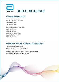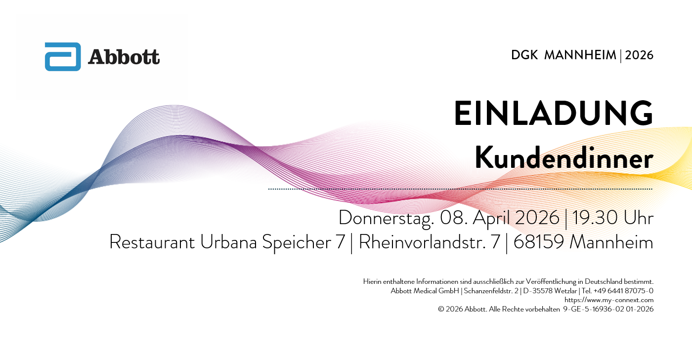 Im Rahmen der DGK Jahrestagung 2026 in Mannheim laden wir Sie herzlich ein, unser umfassendes PFA Portfolio kennenzulernen. Freuen Sie sich auf Impulsvorträge für einen klinische Einblick in das Abbott PFA Universum. Ein Abend voller interessanter Einblicke und fachlichem Austausch mit Kolleginnen und Kollegen, der Innovation greifbar macht.
